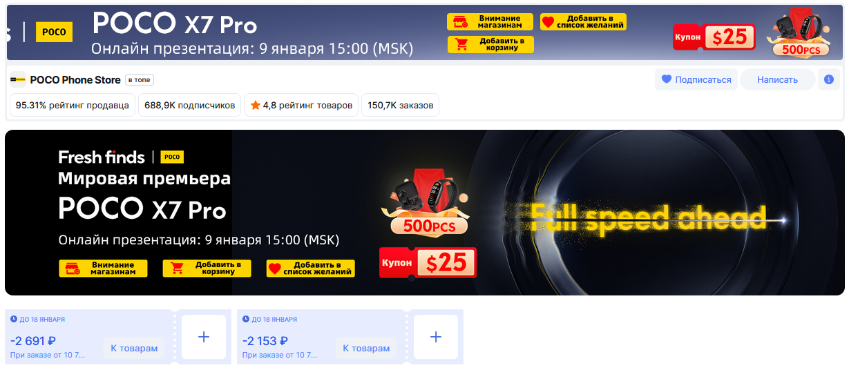 Можете попробовать выиграть один из призов. Для этого нужно до премьеры добавить POCO X7 Pro в корзину и избранное, и подписаться на сам магазин POCO Phone Store.