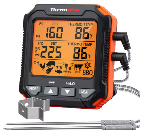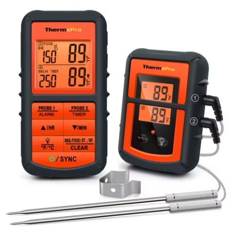 Тот прибор что со щупами находится у места готовки, например на дверце духовки, а второй по безпроводу соединен с первым и его можно поставить в любое удобное место.