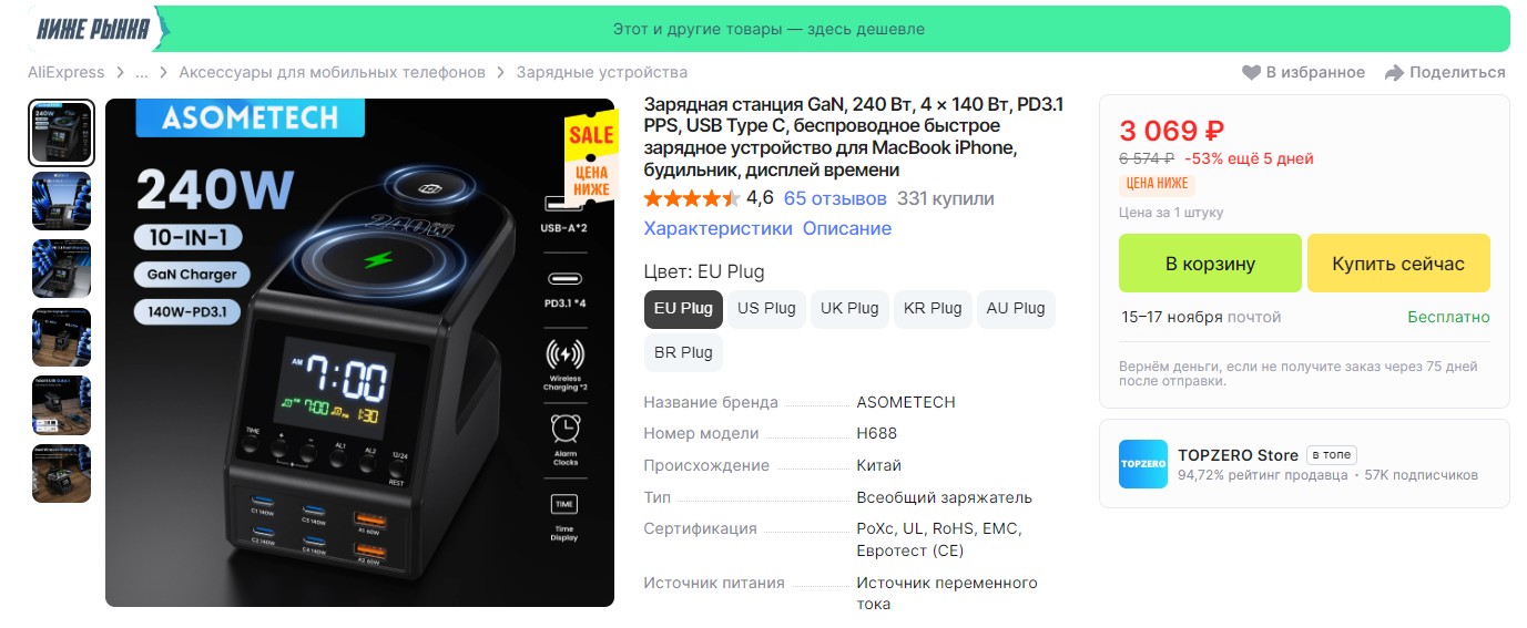 Зарядник за 3.5 евро, а работает как за 35. 1 порт с ПД и 3 обычных USB A и "напряжометр". Пашет как проклятый. Тянет даже ноутбук, выдавая на него ватт 40 а 3 телефона и таблет - вообще без проблем. he.aliexpress.com