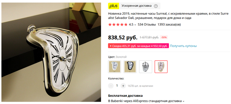 Часы в стиле "Дали" напомнили о часах, которые мы недавно купили в офис - декоративные часы с картой мира. Светятся в темноте! Выполнены очень качественно, выглядят стильно, привлекают внимание всех посетителей. Но обратите внимание на размеры - они точно не соответствуют тому масштабу, что на фото продавца.