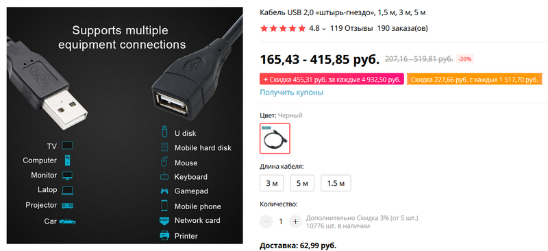 Полезная штука - удлинитель USB-кабеля: папа-мама USB-A. 1,5, 3 и 5 метров.