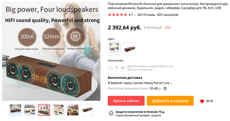 Интересная многофункциональная беспроводная Bluetooth-колонка. Четыре динамика мощностью 20 ватт, встроенные часы, есть будильник, проводное соединение, FM-радио (провод нужно будет подключить), функции гарнитуры (ответ на звонок), воспроизведение с SD-карты.