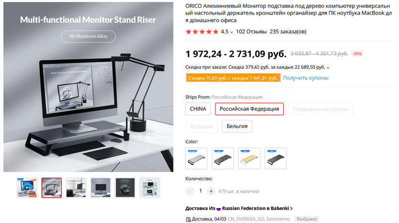 Штука вроде простенькая, но при этом реально очень полезная - подставка для монитора. Приподнимает монитор до уровня глаз - так и работать комфортнее, и осанка не страдает. К тому же под монитор с такой подставкой можно задвинуть клавиатуру, мышку, пепельницу и эспандер для кисти, освободив таким образом место на столе. Видимо, поэтому они эту простую подставку называют мультифункциональной. Есть четыре вида цветов и доставка с российского склада.