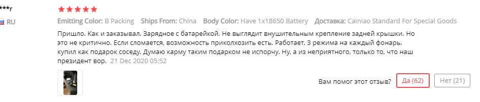 Наткнулся на отличный отзыв на фонарь) Интересно, сольют ли китайцы персональные данные, если что..