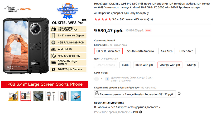 И только что компания Oukitel выпустила модель Oukitel WP8 Pro, где за 9,5 тысячи рублей вы получаете защищенный по стандартам IP69&IP69K смартфон на MediaTek MT6762D с NFC, дисплеем 6,49", памятью 4/64 ГБ и аккумулятором 5000 мА·ч с быстрой зарядкой. При этом он еще достаточно тонкий - 12,7 мм, весит 260 грамм. (Полная спецификация на сайте разработчика.)