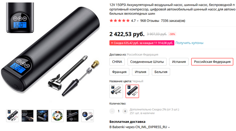 Портативный автоматический насос с аккумулятором и переходниками. Для машин, мотоциклов, велосипедов, мячей, надувных матрацев и так далее. И есть доставка с российского склада. Я похожим давно пользуюсь - очень удобная штука.