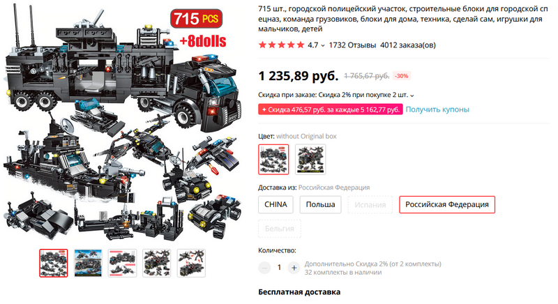 О детях, между прочим, тоже нужно подумать. Знакомый заказал сыну вот такой конструктор - по результатам очень доволен. Там в максимальном варианте, который за 1235, восемь пакетов с деталями и инструкциями, из одного пакета можно собрать три разные машины. Говорит, что качество очень хорошее, собирается и работает четко: все двигается, поворачивается и так далее. Его сын в восторге. Ну, посмотрим, как отреагирует Юный Каталан.