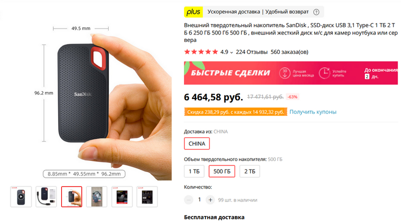 Внешние SSD-диски, подключающиеся по USB 3.0, - очень удобная штука. Они компактные, размером немногим больше флешки, а скорости - под 400 мегабайт в секунду. Я пользуюсь таким SSD KingDian - он до сих пор жив, курилка. Но там размер 120 ГБ, мне его уже маловато, хочется полтерабайта. Ну и производителя бы покруче. Нашел такие диски производства SanDisk. Очень компактные. 500 ГБ за 6400 рублей - вполне нормально, в испанском "Амазоне" этот же диск стоит 9100. Есть доставка с российского склада.
