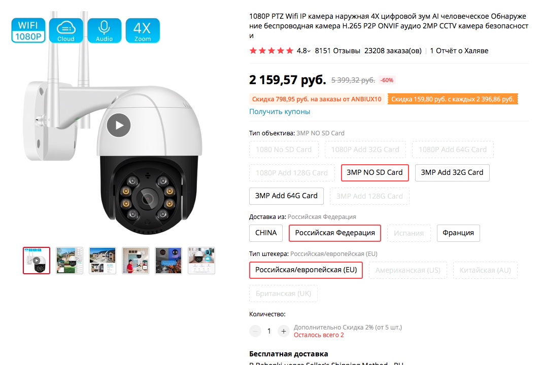 нашелся хороший вариант поворотной камеры. Более 20 тысяч заказов и средняя оценка 4.8. На странице товара код и купон на скидку — на 2 камерах можно существенно сэкономить. Код ANBIUX10 работает до утра 4 октября