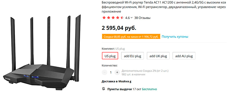 Недорогой двухдиапазонный роутер известного производителя - Tenda AC11. Европейская версия. Позволяет создавать устойчивую сеть Wi-Fi в помещениях до 200 метров. Управляется через приложение, поддерживает Beamforming и MU-MIMO.
