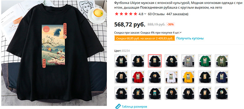 Хлопковые футболки различных цветов с симпатичными принтами в японском стиле. Обязательно сверяйтесь с таблицей размеров, она там есть.