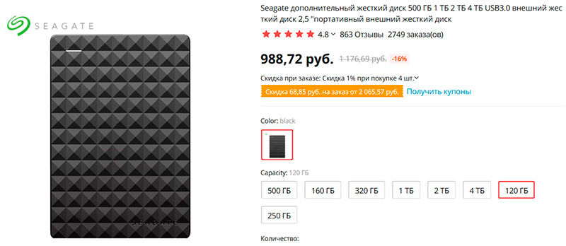 Компактные внешние диски Seagate с подключением по USB 3.0, емкостью от 120 ГБ до 4 ТБ. Под любые задачи хранения, воспроизведения и так далее.