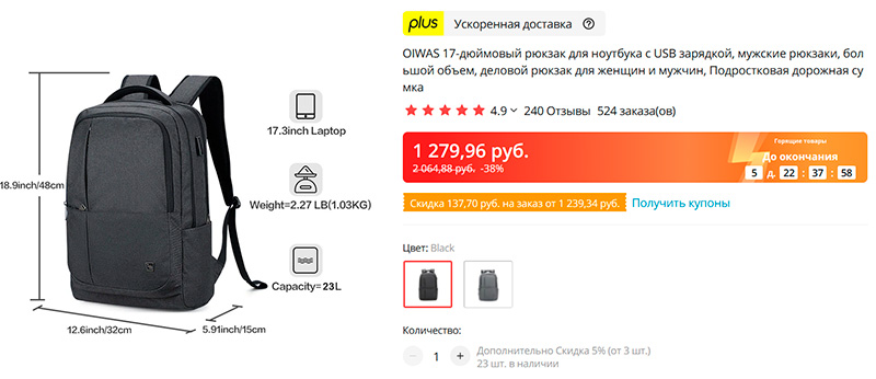 Большой водонепроницаемый рюкзак объемом 23 литра, куда влезет ноутбук с размером экрана до 17 дюймов. Много отделений, порт для зарядки гаджетов, два цвета, ускоренная доставка.