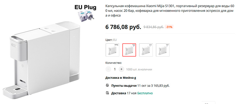 Xiaomi выпустила недорогую капсульную кофемашину для дома и офиса Xiaomi Mijia S1301. Резервуар для воды - 600 мл, давление - 20 бар. Совместима с капсулами Starbucks и Nespresso, а также с капсулами аналогичных размеров. Очень простая в управлении, имеет две кнопки - для приготовления эспрессо 40 мл или американо 110 мл.