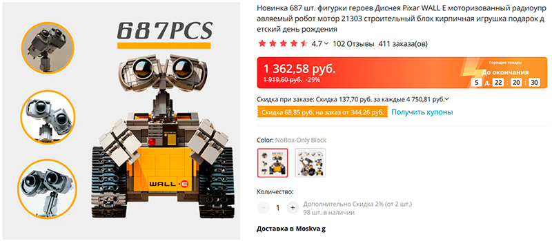 Для любителей конструкторов (а этим и многие взрослые увлекаются, насколько я знаю, не только дети и подростки) - легендарный робот WALL E, состоящий из 687 частей. И здесь есть два варианта: просто робот с цветочком, который он оберегал, а вторая версия - с блоками управления, моторами и пультом управления.