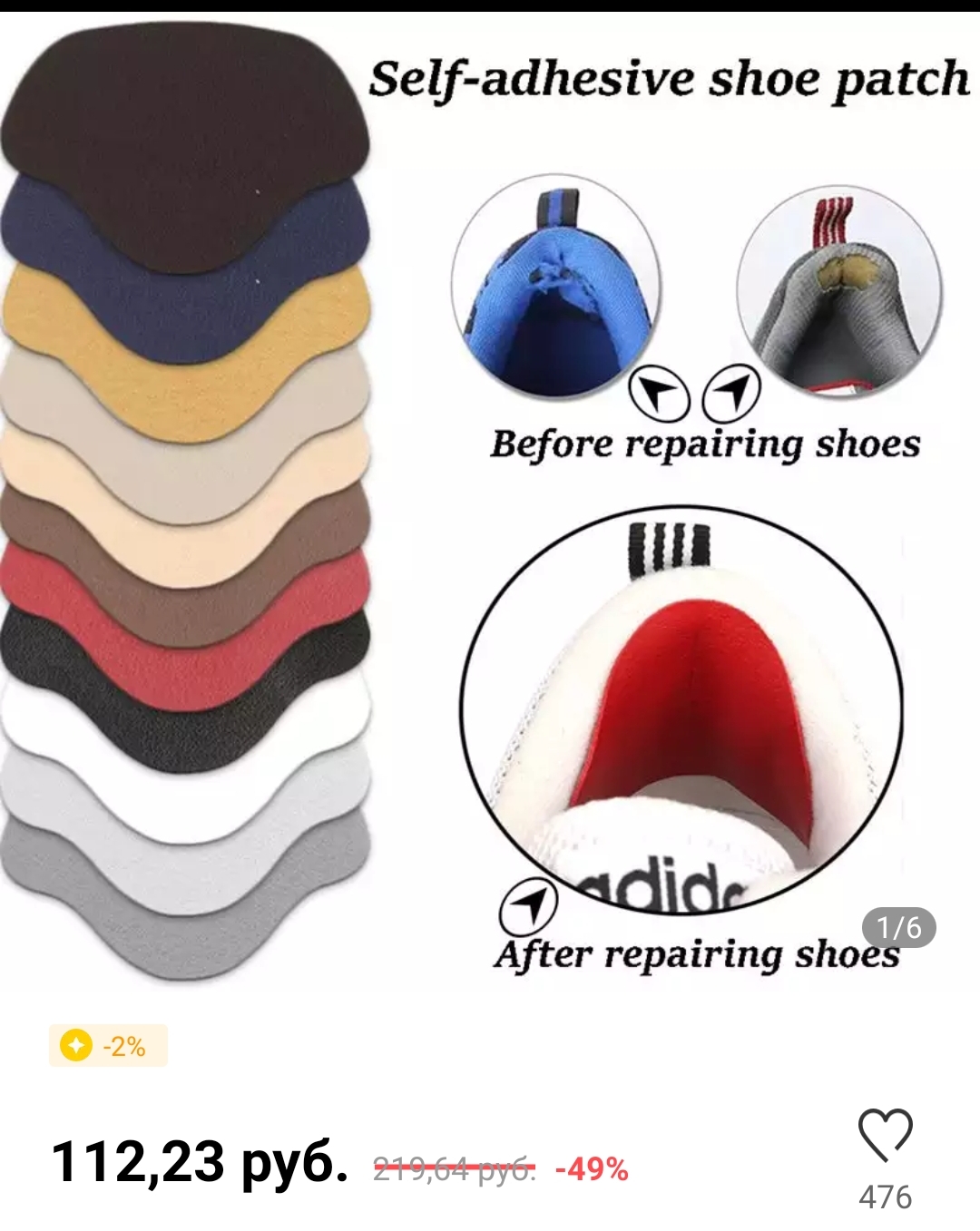 Клейкие заплатки для задников обуви из искусственной кожи. В комплекте одноразовые перчатки и жутко вонючая салфетка для обезжиривания (похоже на скипидар).