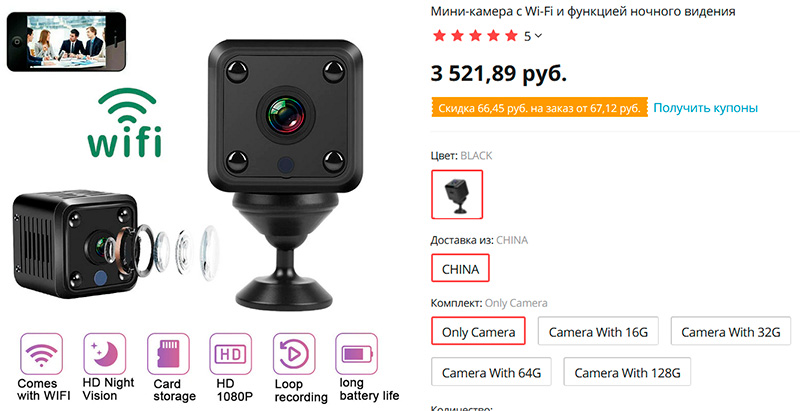 Была у меня такая, действительно компактная, но на этом все положительные качества заканчиваются. Качество записи никакое, никакого ночного режима там нет, есть что то вроде детектора движения, но он работает как придется. Игрушка на пару часов.