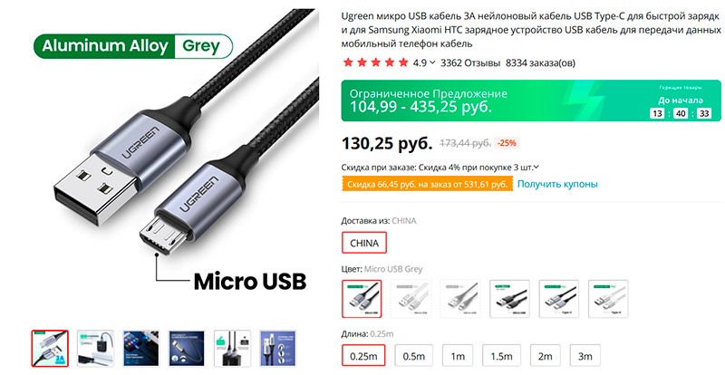 Качественные кабели от Ugreen (я сам такими пользуюсь) с плотной нейлоновой оплёткой и с защитой мест сгибов. С головками microUSB и Type-С и, что самое удобное, аж шести видов размеров: от 0,25 м до 3 м. Прикуплю самый маленький и самый большой, было нужно.
