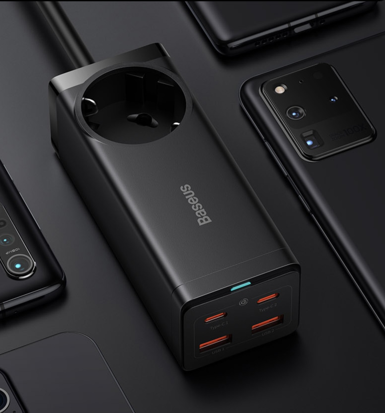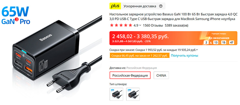GaN-адаптер от Baseus на 4 порта (могут заряжать одновременно) - на 65 ватт и на 100 ватт. Длина кабеля - 1,5 метра. Поддерживает протоколы QC4, PD3, SCP, FCP, AFC и PPS. Подходит для зарядки ноутбуков, планшетов, смартфонов и так далее. Есть доставка с российского склада.
