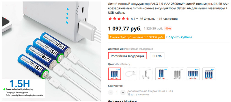 Перезаряжаемые литий-ионные аккумуляторы PALO 1,5 V на 2800 мВч, не требующие специального зарядного устройства, так как заряжаются через порт microUSB. Комплекты по 2, 4, 6 или 8 штук. Есть доставка с российского склада. К ним можно докупить дешевый провод USB-A с четырьмя хвостами microUSB.