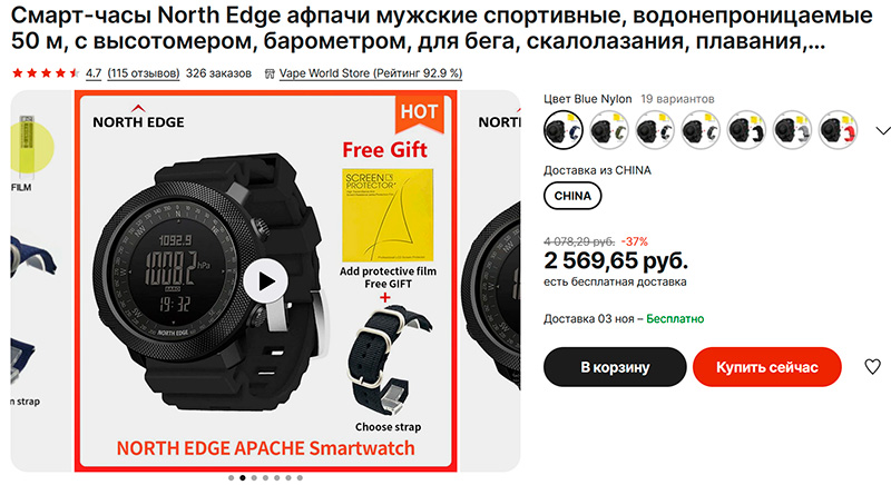Мужские часы North Edge Apach в защищённом корпусе с компасом, шагомером, будильником, таймером, барометром и другими возможностями. Можно выбрать вариант с запасным ремешком, и в отзывах советуют брать дополнительный ремешок, потому что комплектный ремешок, как говорят, довольно хилый.