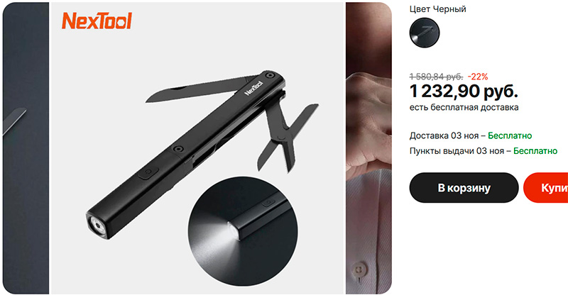 Компактный мультитул: фонарик, нож, ножницы. Фонарик имеет два режима свечения, заряжается через USB. На максимальной яркости время работы - 1,5 часа.