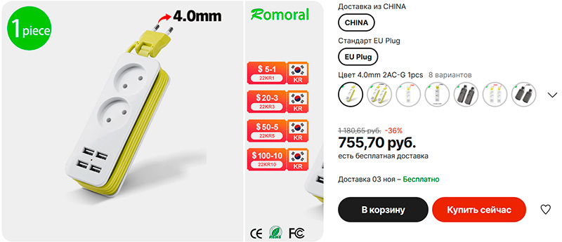 Удобный удлинитель с европейской вилкой, фиксацией провода и вилки, с четырьмя USB-портами.