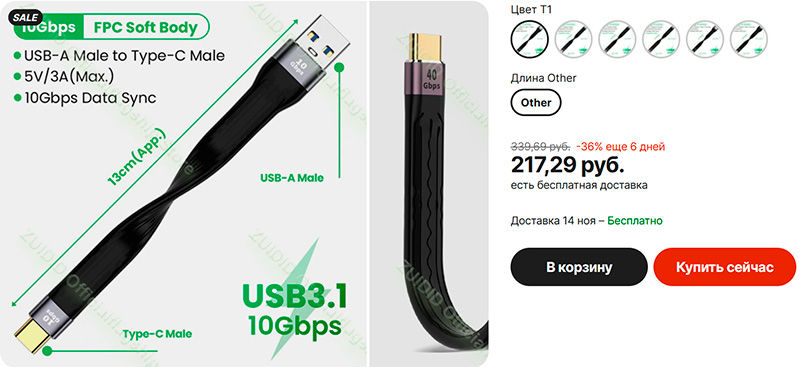 Короткие кабели (13 см) USB-A - USB-C, USB-C - USB-C (поддерживают PD 60 ватт), а также переходник с USB-A на маму USB-C (для использования с USB-A кабеля с двумя Type-C) и переходник с мамы USB-A на USB-C.