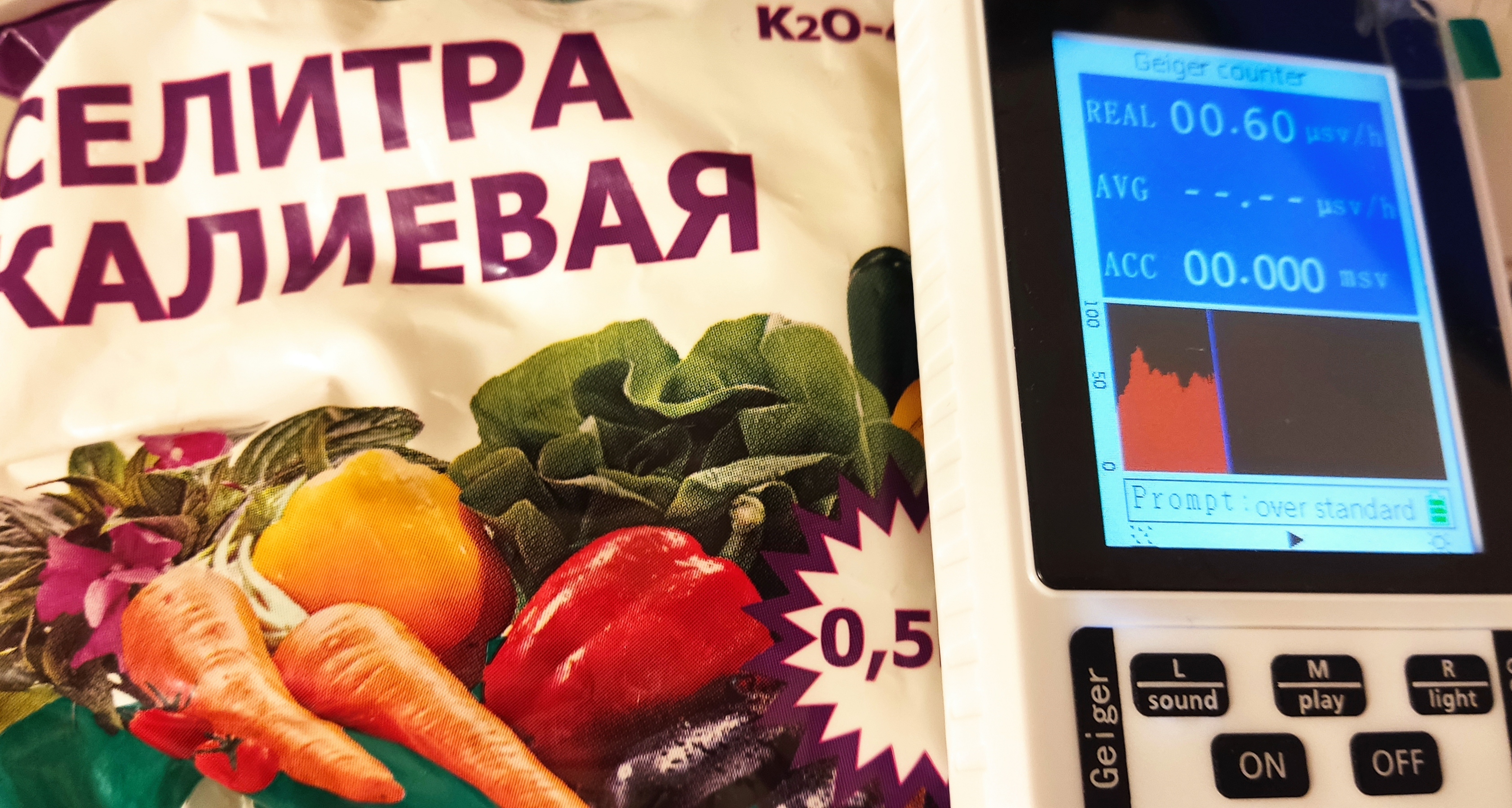 Правда там бета и пришлось раскрутить корпус и прямо саму колбу счётчика к пакету с селитрой приложить, но правда работает - дощёлкал до 60, при обычном фоне в 20.