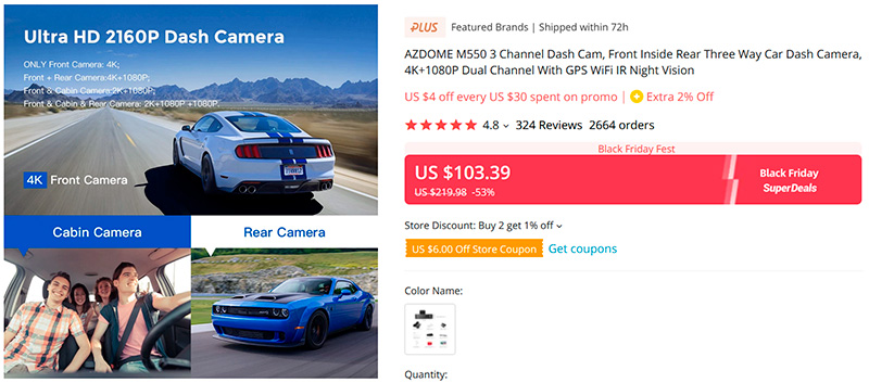 Еще можно успеть купить с хорошей скидкой (в испанском Амазоне он стоит €135) трехкамерный видеорегистратор AZDOME M550. У основной камеры разрешение 4К (реальное), также есть салонная камера и задняя камера - обе с разрешение FullHD. Плюс большой дисплей, встроенный GPS, управление через приложение по WiFi и карта на 64 ГБ в подарок. Хороший комплект, куплю его поизучать.