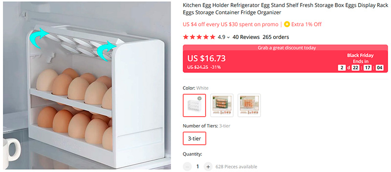 Три вида трехуровневых подставок для яиц - и удобно, и место в холодильнике экономится. Два верхних уровня откидываются для удобства доступа к нижними рядам.