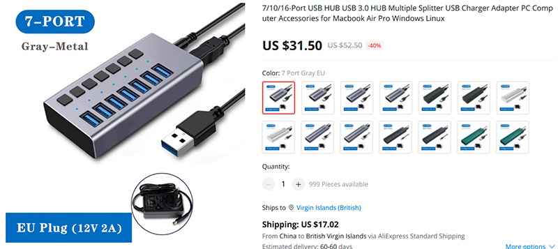 Когда нужно иметь хаб с питанием на много портов, да еще и USB 3.0, то вот хороший вариант - многопортовик на 7, 10 или 16 портов с разными вилками (выбирайте EU).