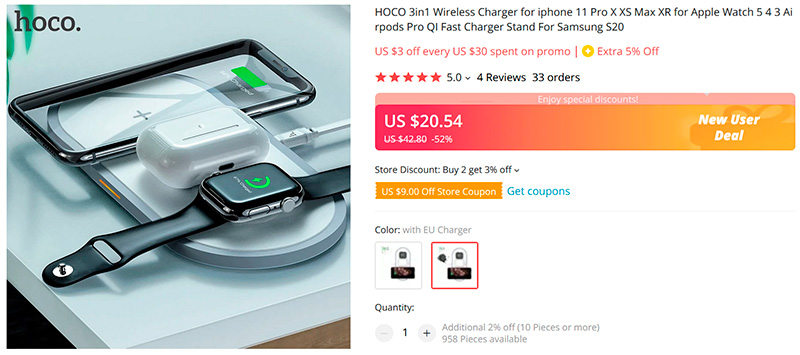 Беспроводная зарядка Hoco "3 в 1": позволяет одновременно заряжать смартфон, беспроводные наушники и часы. Мощность - 10 ватт. Поддерживает стандарты QC3.0 и Qi. Есть комплектация без зарядного адаптера, есть с зарядным адаптером.