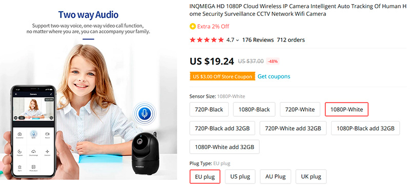 Совсем недорогая веб-камера INQMEGA HD 1080P с хорошим набором функций: управляется по Wi-Fi через приложение, имеет разрешение FullHD, датчик движения, режим сопровождения движения, ночной режим, разговор через камеру, отправка записей в облако.