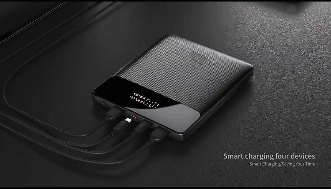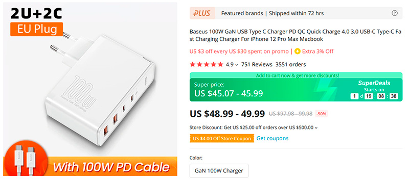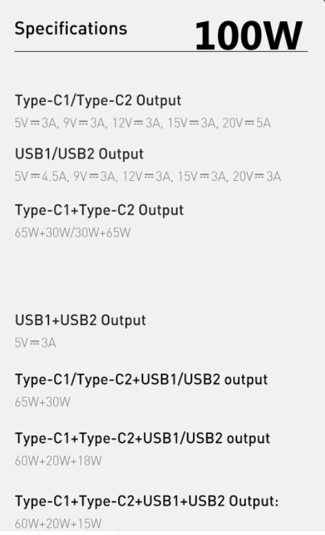 Четырехпортовый (2A - 2C) GaN-адаптер Baseus на 100 ватт. Поддержка PD 4.0, QC 4.0, подходит для ноутбуков. Кабель на 100 ватт входит в комплект. Я сам таким давно пользуюсь, нареканий нет.