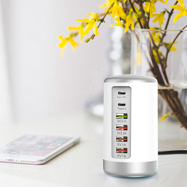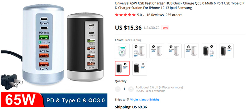 Любопытный универсальный шестипортовый адаптер на 65 ватт суммарной мощности - эдакая семейная зарядная станция для смартфонов/планшетов (внимание - для ноутбуков она не подходит). Четыре порта USB-A: два маломощные на 5 ватт, один на 20 ватт и еще один с поддержкой QC 3.0 на 24 ватта. Плюс два порта USB-C на 18 ватт.