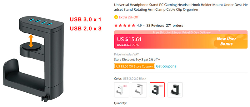 Я уже писал об удобных держателях для наушников подобного типа, которые не занимают место на столе. А вот тут обнаружился более продвинутый и интересный вариант - держатель для наушников, он же USB-хаб на 4 порта. А что - классное и удобное решение, заказываю себе! Там два варианта цветов - белый и черный. И есть еще в два раза дешевле обычные держатели такого типа, но зачем вам держатель без USB-хаба, право слово? Мне точно нужен с хабом. Кстати, у этой модель нижняя часть поворачивается на 360 градусов, что тоже очень удобно.