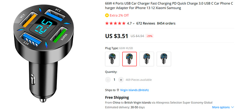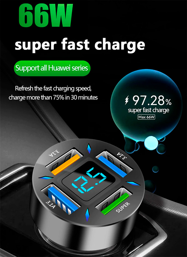 Быстрая зарядка для машины на четыре порта с дисплеем. Четыре варианта, у самого продвинутого - один порт на 66 ватт и три порта на 15,5 ватт. Заказал себе, проверю в работе.
