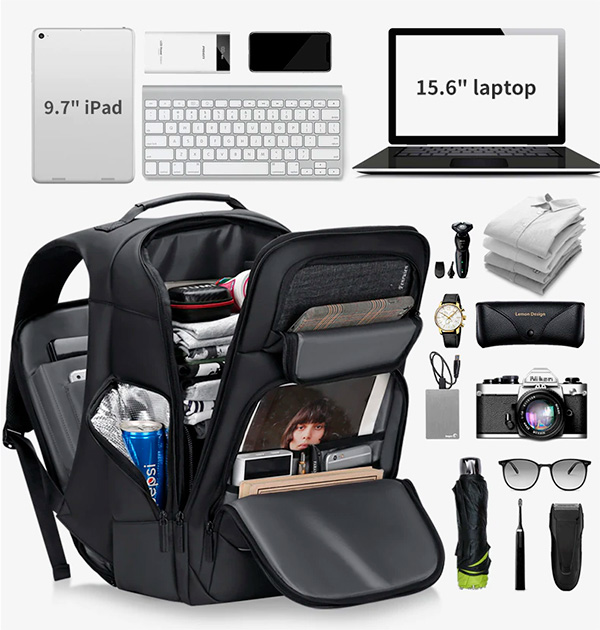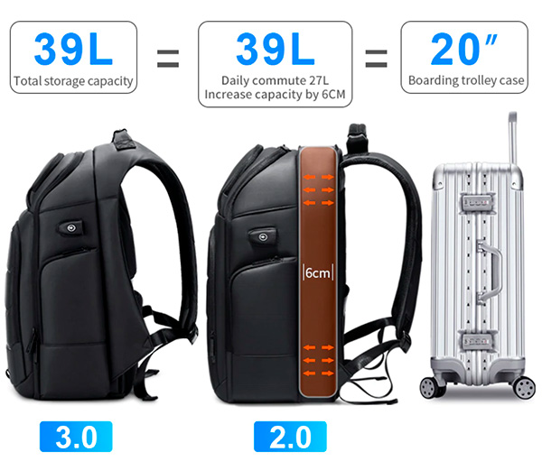 Городской рюкзак с эргономичной спинкой, регулируемыми лямками и держателем для ручки чемодана. Внутри находятся несколько вместительных отделений и карманов, есть защищённый отсек для ноутбука с экраном до 15,6". Рюкзак может расширяться на 6 см для увеличения объема с 27 до 37 литров, есть порт для зарядки устройств. В наличии две модели, слегка отличающиеся друг от друга.