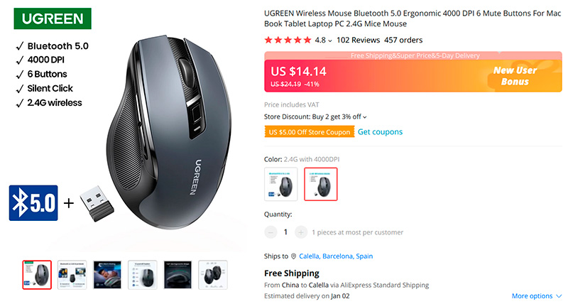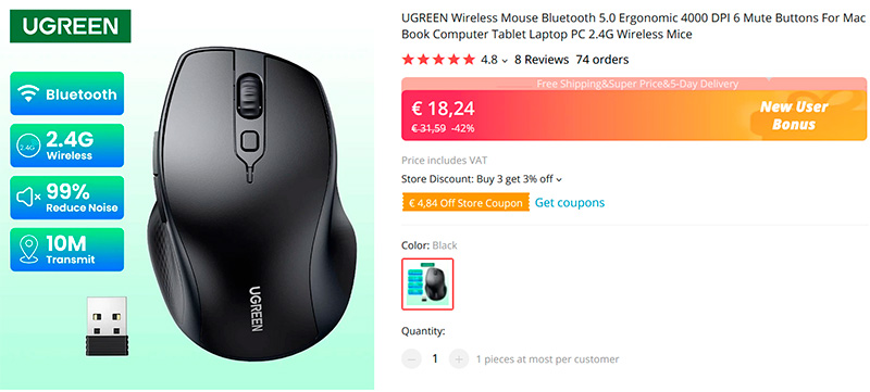 Компактная эргономичная мышь от Ugreen с разрешением до 4000 dpi и тихим кликом клавиш с поддержкой беспроводного подключения через USB-адаптер и подключения по Bluetooth (что особенно ценно для ноутубков, где каждый USB-порт на счету).