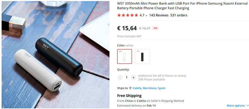 Миниатюрный внешний аккумулятор размером в губную помаду. Емкость - 3350 мАч, ее вполне хватит, чтобы зарядить разряженный смартфон где-то наполовину, а что еще надо? Два цвета.