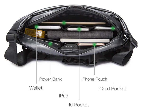 Вместительная сумка-мессенджер из непромокаемого полиэстера для ношения спереди или сзади. Кроме основного отделения есть несколько специальных отделений для смартфона, кошелька, зонтика и так далее. В основное отделение поместится 9,7-дюймовый планшет. Есть также убирающийся в сумку держатель для ключей. Две модели - черная и серебристая.