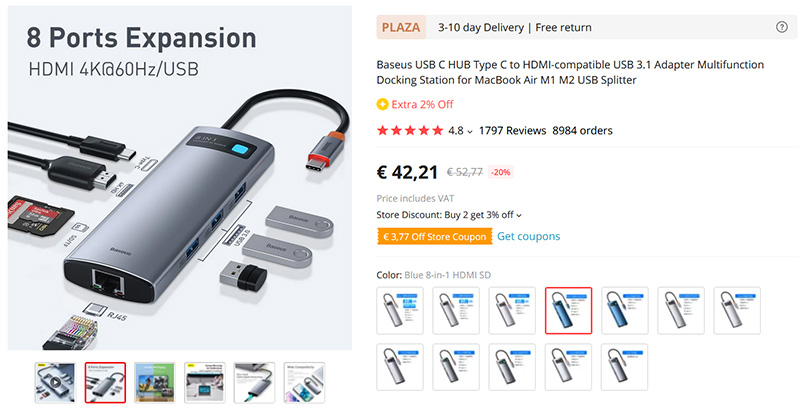 Новые модели USB-хабов от Baseus - для ноутбуков и ПК с портом Type-C. Самый продвинутый вариант "8 в 1": 3 порта USB 3.1, Type-C PD, RJ-45, слот под карты памяти SD и microSD (через переходник), Ethernet и HDMI 4K 60HZ. Но есть варианты проще и дешевле: "6 в 1" и "4 в 1".