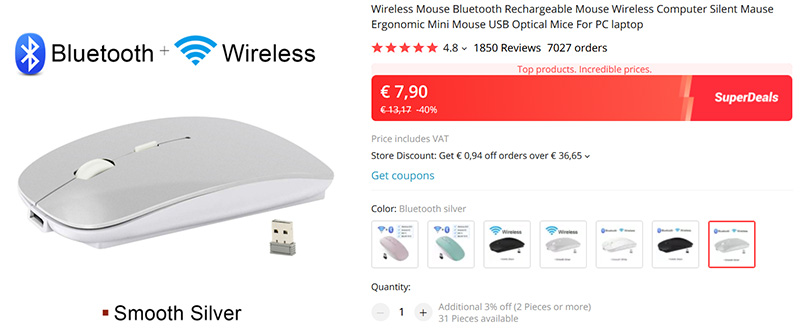 Обратите внимание, что там разные модели мышей. Покупал тот и тот вариант. Мышь WiFі+BT более требовательна к поверхности, у меня без коврика на некоторых столах были глюки с позиционированием. Мышь без ВТ работет отлично.