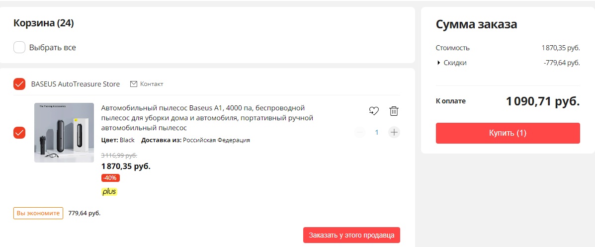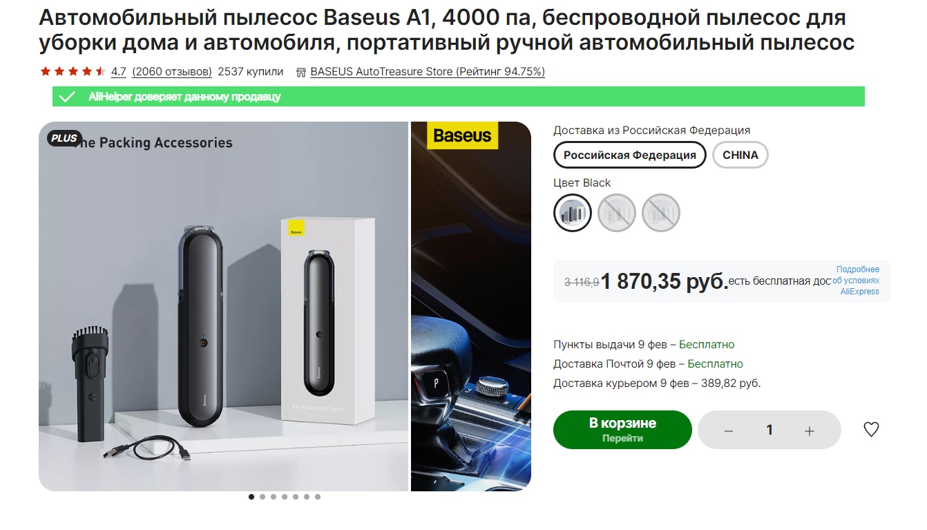 Портативный беспроводной автомобильный пылесос Baseus A1 по супер цене за 1 090,71 руб.