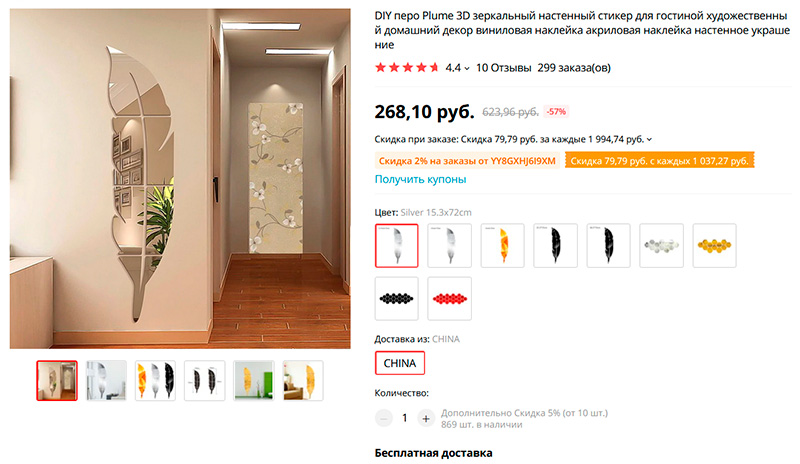 Любопытная штука - зеркальная наклейка-перо, здорово оживляющая интерьер. Есть разных цветов.