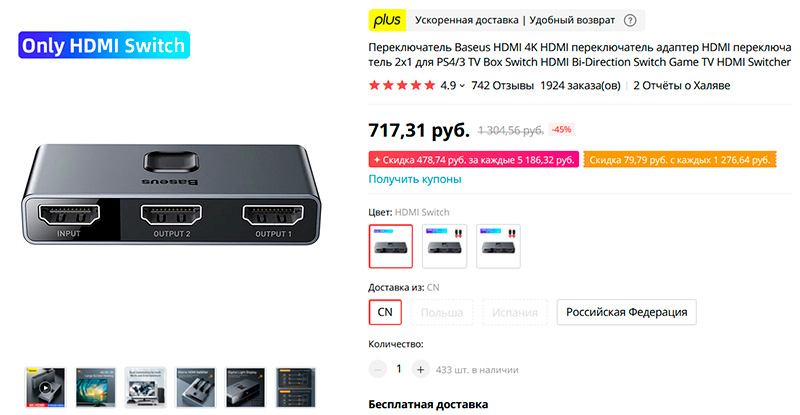 Старый телевизор, один порт HDMI, а у вас - компьютер, игровая приставка и медиаплеер? Есть хороший разветвитель HDMI от Baseus, причем с поддержкой 4K.