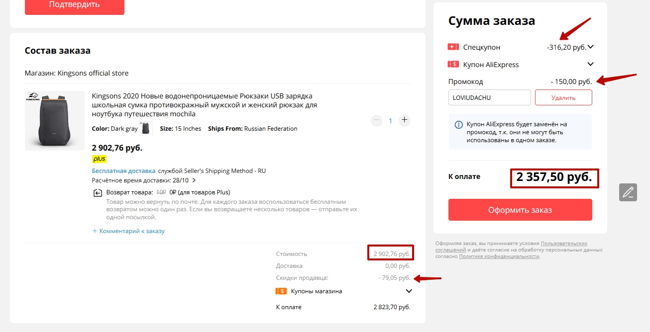У меня получилась скидка 158р. x 2 (спецкупон у меня умножился в 2 раза) + 150р. (промокод LOVIUDACHU) = около 560 рублей. Да, еще 79р. от продавца