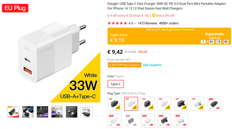 Популярные среди владельцев айфонов, айпэдов и макбуков недорогие двухпортовые зарядные GaN адаптеры Essager на 30/33 ватт. Поддержка быстрой зарядки QC 3.0 и Power Delivery, может  питать макбуки, имеет два порта - USB-A и Type-C. Заряжает iPad Pro с нуля за 2 часа.