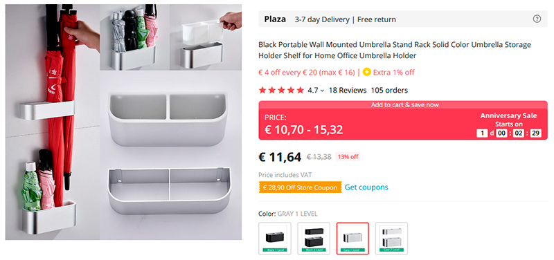 Штука вроде простая и совсем недорогая, но очень полезная - держатель для зонтов с емкостью для сбора влаги. Состоит из двух частей - держателя и поддона (это для зонтов-тростей). Крепится к стене на двухсторонний скотч. Два цвета, съемная емкость. Есть версия только для складных зонтов, есть универсальная: для тростей и складных зонтов.